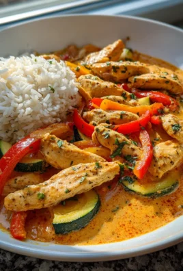 Das Gericht sieht einfach verführerisch aus: saftige Hähnchenstücke, die in einer cremigen, goldgelben Sauce schwimmen, umgeben von leuchtend roten und grünen Paprikastreifen sowie zarten Zucchinischeiben. Und der Duft! Die Kombination von gebratenem Hähnchen und den süßen, gerösteten Paprika entfaltet sich in der Luft und lässt einem das Wasser im Mund zusammenlaufen. Wenn ich den ersten Bissen nehme, bin ich überwältigt von der harmonischen Balance zwischen der Sahnesauce und der frischen, knackigen Gemüsevielfalt.